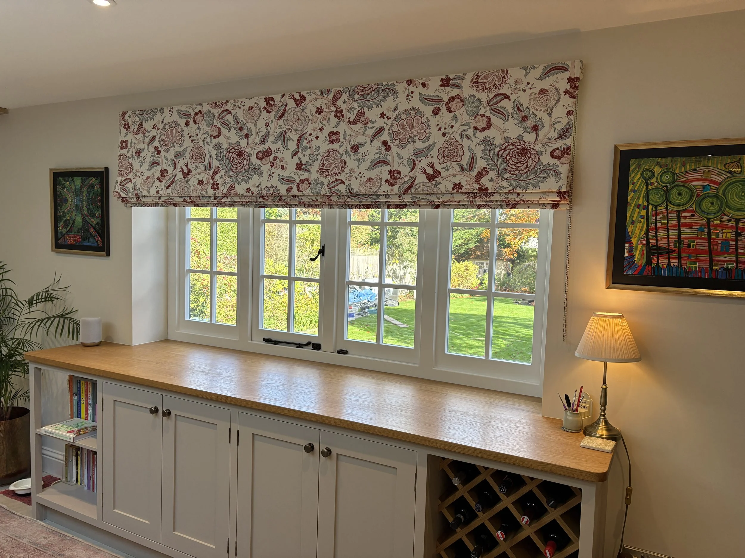 “Alex has just completed work for me, making new silk curtains for our dining room and a blind for the bathroom. Both have been immaculately finished to an extremely high standard and look absolutely stunning. She also repurposed the material from the previous curtains to refresh those in another room. She was very helpful throughout, advised on curtain poles, tie-backs and blind mechanisms and fitted everything herself. I am absolutely delighted with the results.”